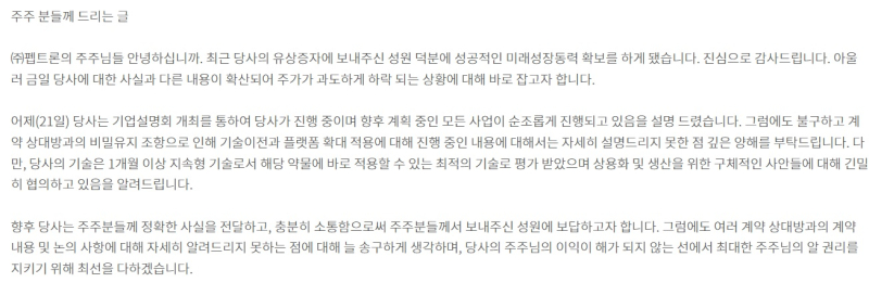 이 같은 발표는 최근 릴리가 또 다른 기업과 비만 치료제 관련 신규 계약을 체결했다는 외신 보도 이후 시장 일각에서 펩트론과의 협력 관계에 의문이 제기된 데 따른 해명 성격으로 풀이된다.