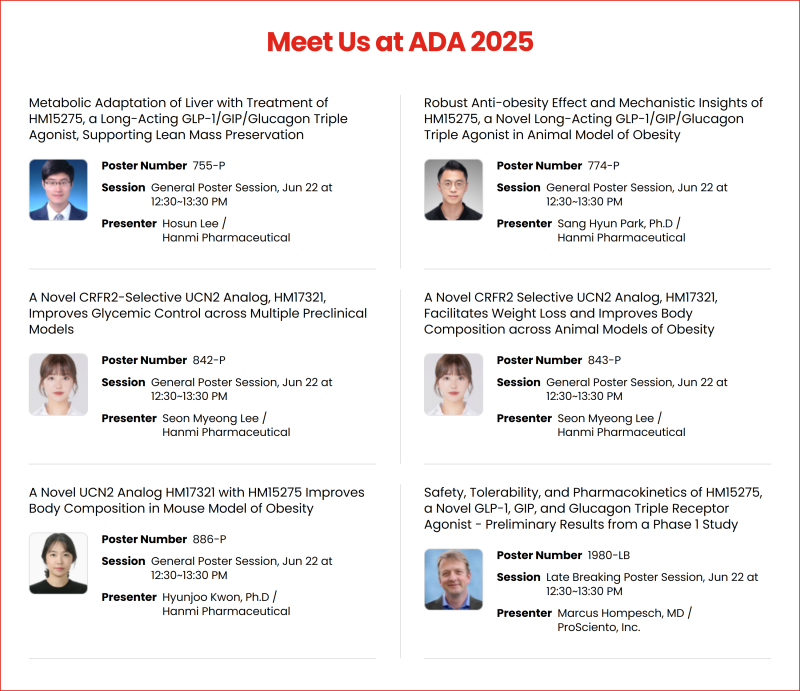 최인영 한미약품 R&D센터장은 “이번 ADA 2025는 한미가 오랜 기간 축적해온 대사, 내분비 질환 혁신신약의 연구 역량과 글로벌 경쟁력을 입증하는 중요한 무대”라며 “한미는 기존 비만 치료제의 한계를 뛰어넘는 새 작용 기전은 물론 차별화된 개발 전략을 통해 전세계 비만 치료 패러다임을 선도하는 ‘글로벌 프론티어’로 도약하고, 전사적 역량을 결집해 최단 시간 내 비만 신약의 상용화를 실현하도록 전력을 다하겠다”고 말했다.