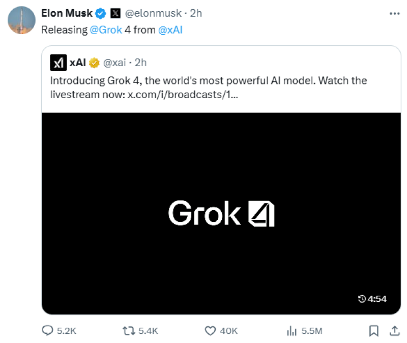 일론 머스크(Elon Musk)의 xAI가 9일(현지시간) 최대 150만명이 시청한 생중계를 통해 최신 AI 모델 '그록4(Grok 4)'를 공식 출시했다.