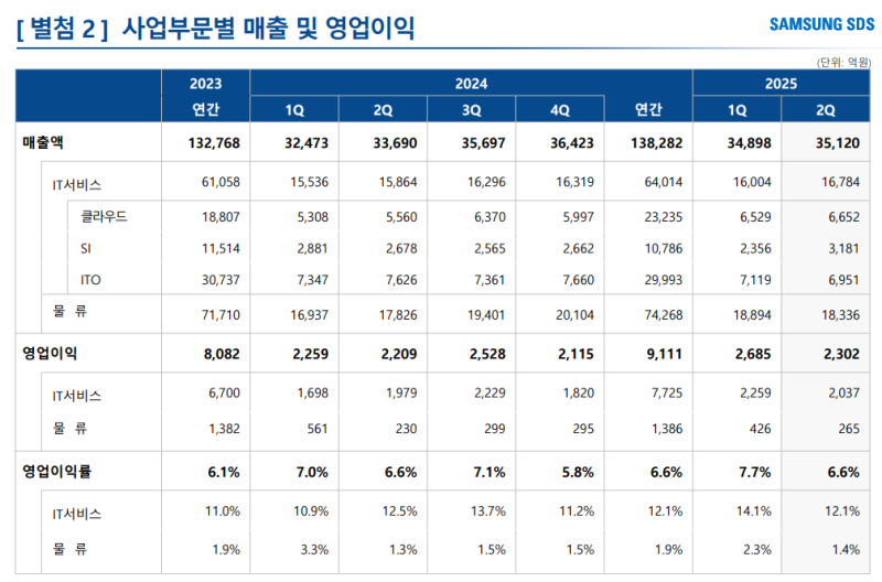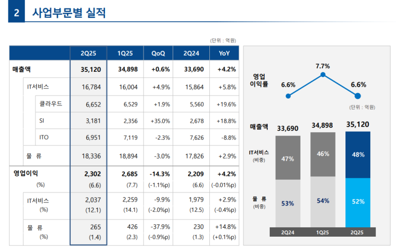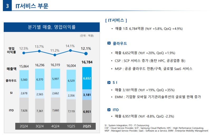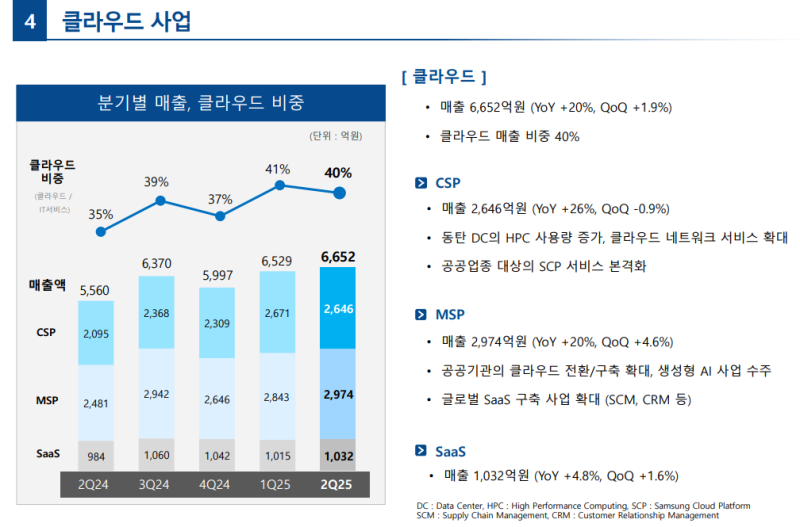 • 2분기 클라우드 매출 6,652억원 (YoY +20%), IT 서비스 매출의 40% 비중 유지