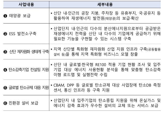 선정된 산단은 지속가능한 탄소중립 생태계 구축을 위해 ▲태양광 등 신재생에너지 설비 보급 ▲에너지저장시스템(ESS) 설치 ▲재자원화 생태계 구축 ▲탄소감축기업 컨설팅 ▲글로벌 탄소규제 대응 ▲친환경 설비 보급 등을 지원하며 탄소중립 산단 전환을 위한 기반을 마련해 나갈 계획이다.