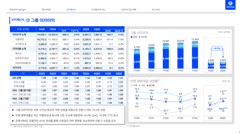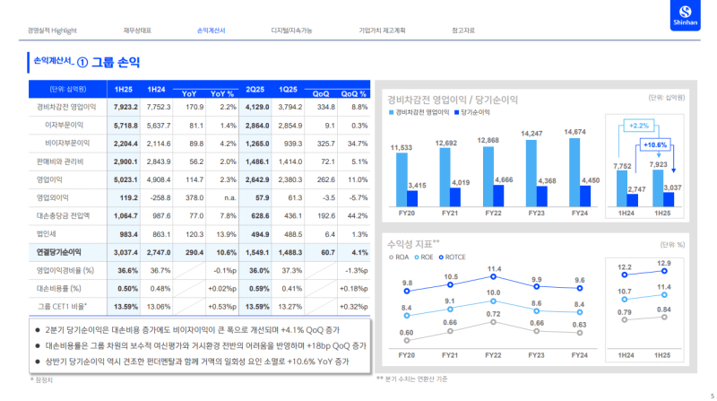 • 2025년 2분기 당기순이익은 대손비용 증가에도 비이자이익 부문이 개선되며 전분기 대비 +4.1% 성장한 1조 5,491억원 시현