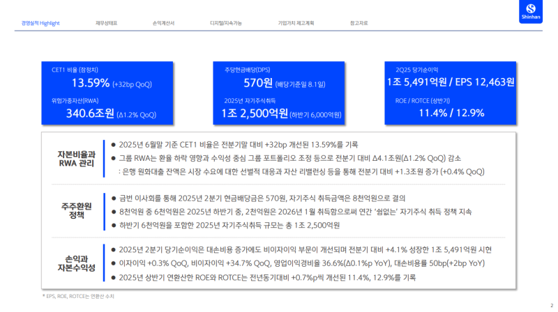 • 금번 이사회를 통해 2025년 2분기 현금배당금은 570원, 자기주식 취득금액은 8천억원으로 결의
