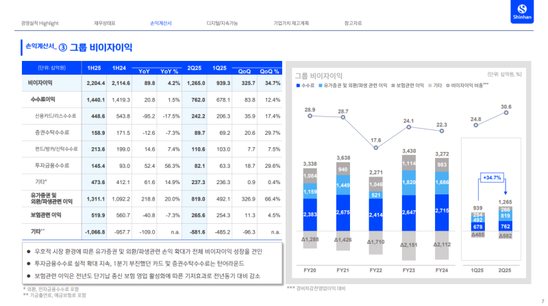 • 특히 우호적인 시장 환경에 힘입어 유가증권 및 외환·파생 관련 손익이 크게 증가하며 전체 비이자이익 성장을 견인