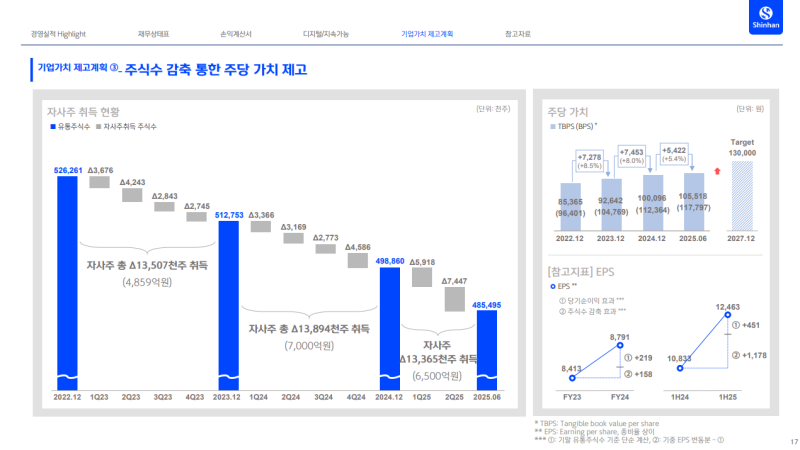 • 하반기 6천억원을 포함한 2025년 자기주식취득 규모는 총 1조 2,500억원
