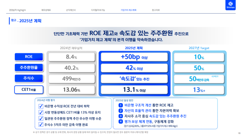• 신한금융의 기업가치 제고 계획은 ROE와 PBR 수준에 따라 자원을 효율적으로 배분하는 것이 기본 원칙