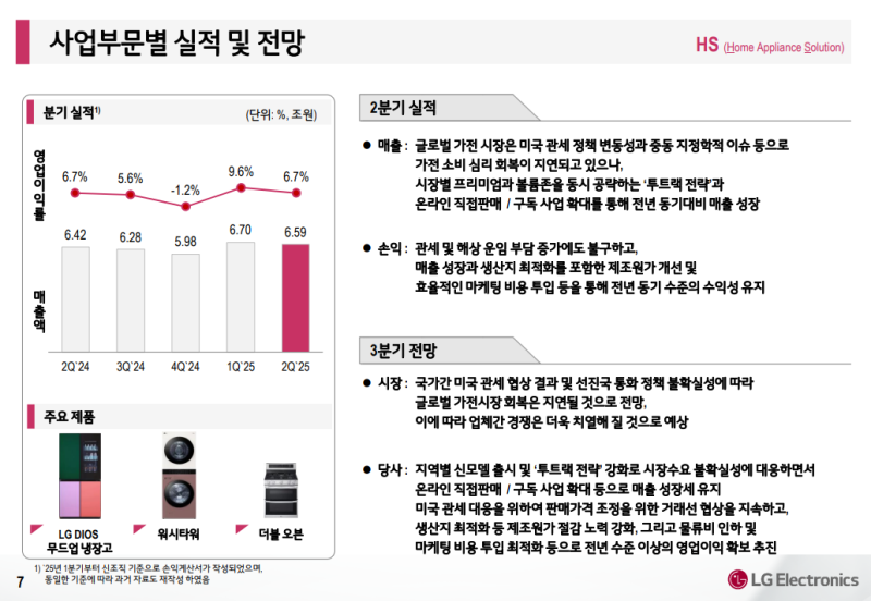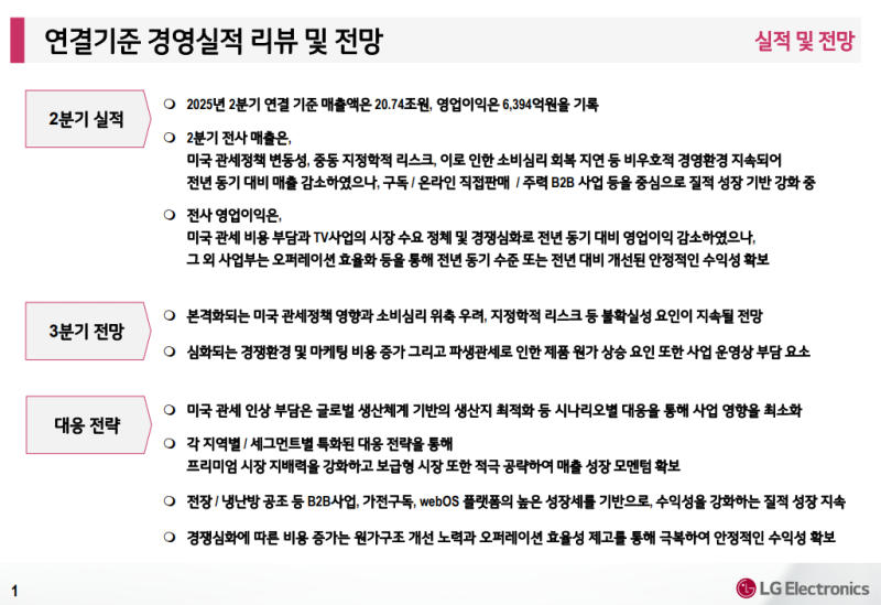 • TV 사업의 수요 정체와 경쟁 심화, 관세 부담 등으로 전사 영업이익 감소