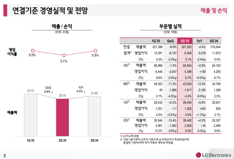 • 연결 기준 매출액: 20조 7,352억 원 (QoQ -8.8%, YoY -4.4%)