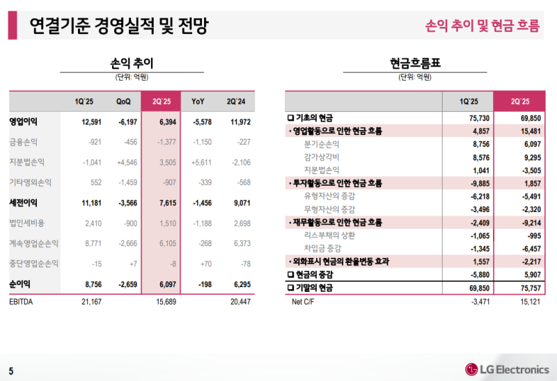• 영업이익: 6,394억 원 (QoQ -6,197억 원, YoY -5,578억 원)