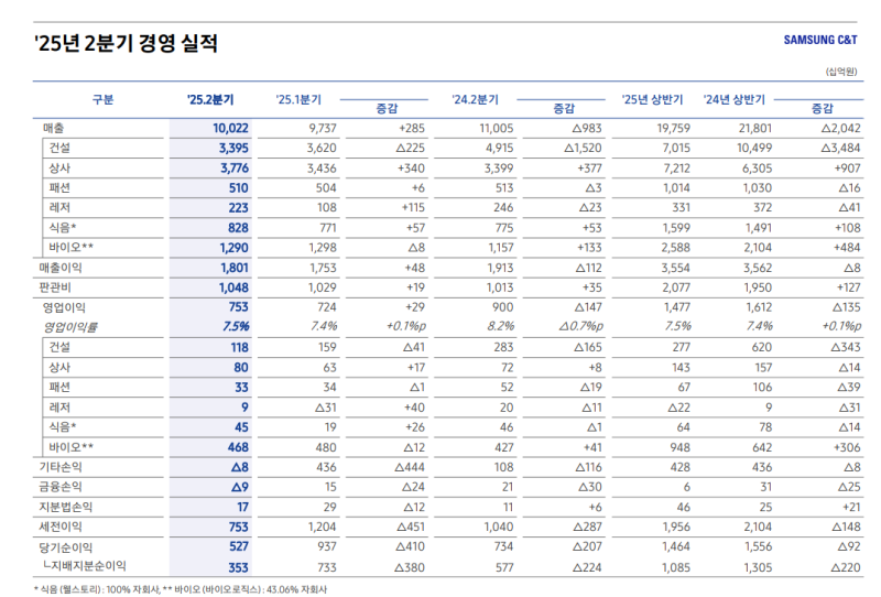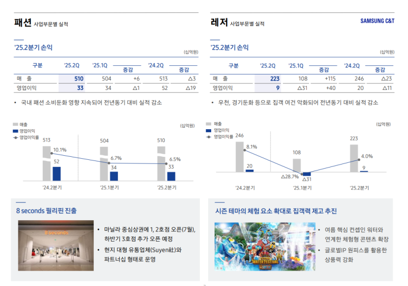 • 건설 매출은 둔화되었으나, 패션·레저·식음 부문은 계절적 요인으로 실적 개선