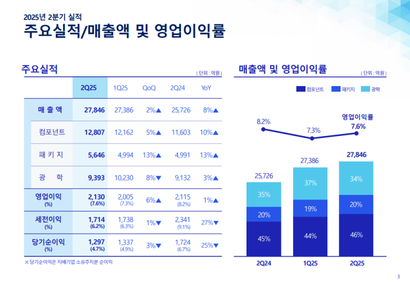 • 2분기 실적은 산업·전장용 MLCC 매출 증가, AI 가속기용 기판 양산 및 서버용 기판 매출 확대 등 고부가 제품 판매 증가로 개선