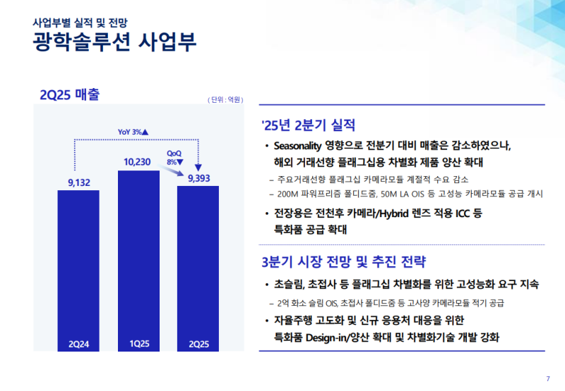 • 3분기는 관세 인상·환율 변동 등 대외 불확실성 지속, 수요 가시성은 낮으나 주요 거래선 플래그십 스마트폰 출시, AI 서버·네트워크·ADAS 등 산업·전장용 제품 견조 수요로 전분기 대비 성장 가능 전망
