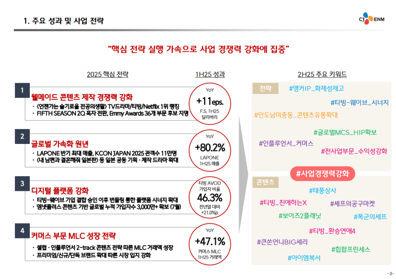 • JO1, INI, ZB1 등 자체 아티스트 활동 확대 및 KCON JAPAN 2025 흥행 기여