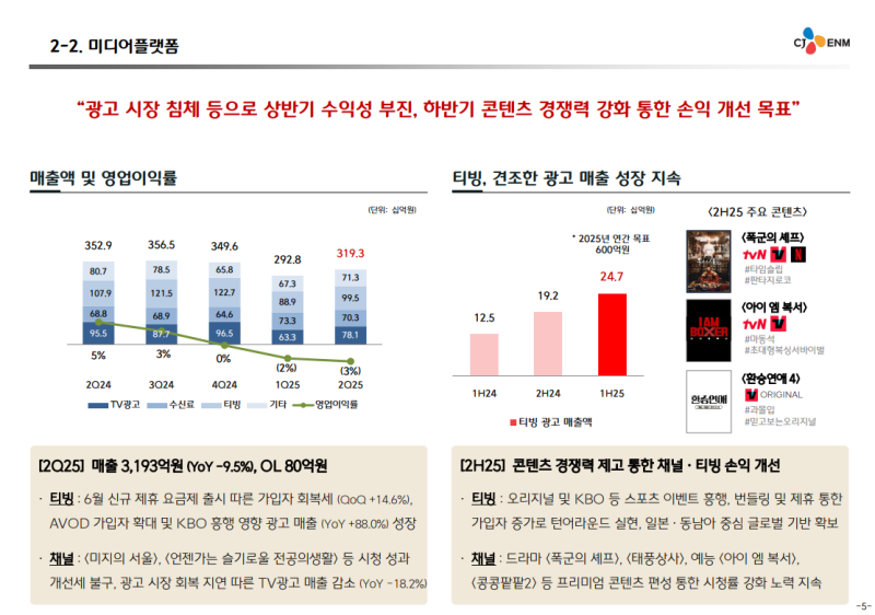 • 티빙 2Q25 매출액: 995억 원, 영업손실: 240억 원