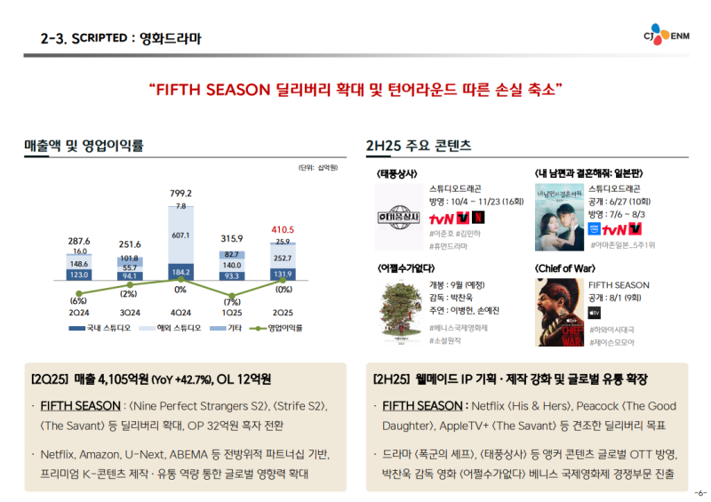 • FIFTH SEASON 2Q25 매출액: 2,593억 원, 영업이익: 32억 원 (흑자 전환)