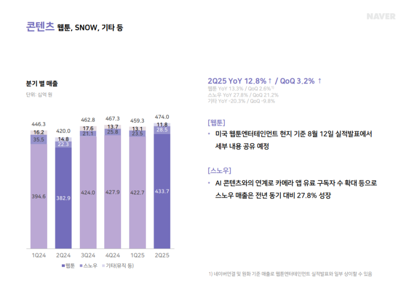 • 웹툰: 4,337억 원 (YoY +13.3%, QoQ +2.6%), 세부 내용은 8월 12일 웹툰엔터 실적 발표 예정