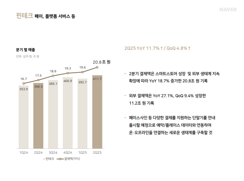 • 2Q25 네이버페이 결제액: 20.8조 원 (YoY +18.7%, QoQ +6.3%)