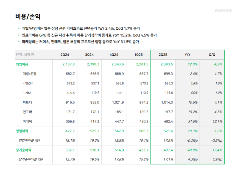• 마케팅비는 커머스 쇼핑 쿠폰, 핀테크·웹툰 프로모션 증가로 전년동기 대비 31.5% 증가, 전분기 대비 12.1% 증가