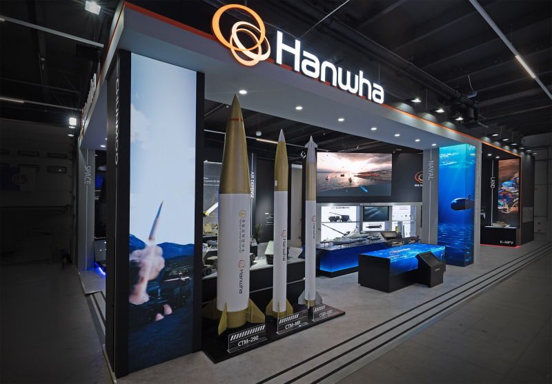 한화는 299㎡(약 90평) 규모의 통합 부스를 마련하고 잠수함, 수상함, 지상 장비, 우주 방산 기술까지 아우르는 통합 역량을 강조한다.