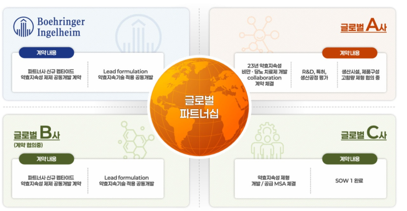 글로벌 B사는 파트너사의 신규 펩타이드 약효지속성 제제 공동개발 계약 건이다. 지투지바이오와 약효지속기술 적용 공동개발을 목표로 한다.