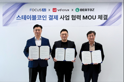 포커스에이아이는 블록체인 기반의 스테이블코인 결제 솔루션 개발을 위해 브이디크럭스·비토즈와 3자 업무협약(MOU)을 체결했다고 16일 밝혔다.