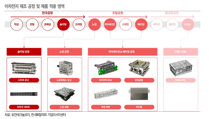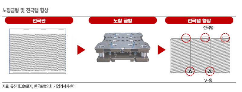 유진테크놀로지는 삼성SDI에 노칭 금형을 독점 공급 중이고, LG에너지솔루션에는 약 60%의 점유율을 보유하고 있으며, SK온 또한 양산 테스트를 통과해 공급을 시작한 상태다.