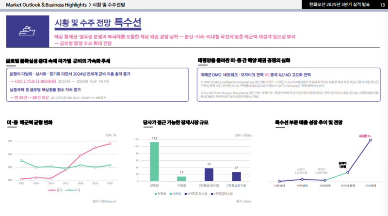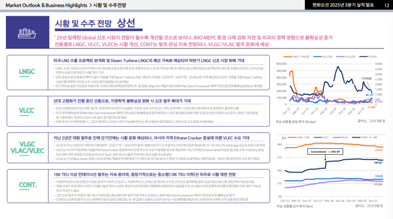 • 이러한 환경에도 2025년 3분기 기준 LNGC 6척, VLCC 12척, 컨테이너선 13척 등 총 31척(60.4억 달러) 수주 기록