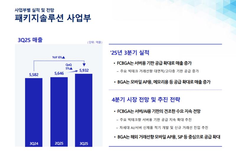 • FCBGA는 서버 CPU향 매출 확대와 AI 가속기용 제품 양산 본격화로 대면적·고다층 제품 중심의 제품 믹스 개선 진행