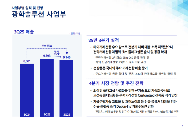 • IT·전장 고객별 니즈에 맞춘 가변조리개, 초경박단소 모듈, 연속줌, 폴디드 모듈 등 차별화 기술 제안으로 고부가 제품 중심의 매출 확대 추진