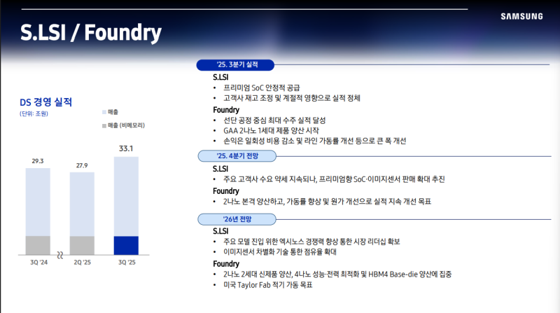 • 4분기에는 2나노 1세대 공정 적용 신제품 양산 본격화와 미국·중국 주요 고객사의 HPC·오토향 제품 및 메모리 제품 판매 확대를 통한 매출 증가 기대