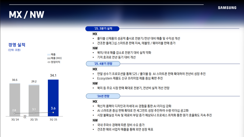 • MX는 폴더블·S 시리즈 판매 호조, AI 기능 사용률도 높아 플래그십 중심 전략 강화