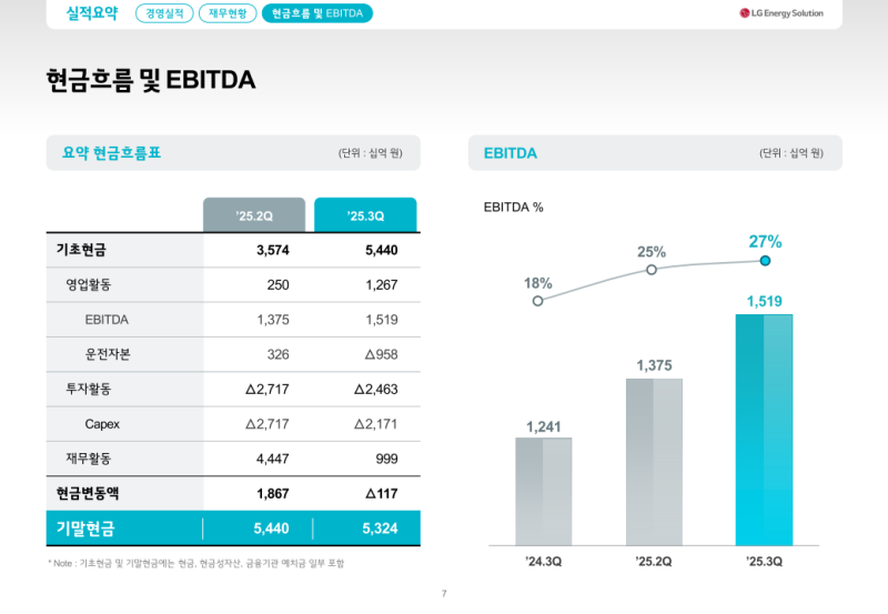 • 이번 분기 EBITDA는 약 1.5조 원이며 EBITDA Margin은 전분기 대비 1.9%p 상승한 27%