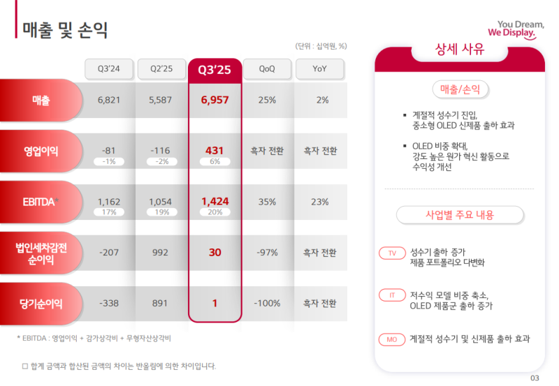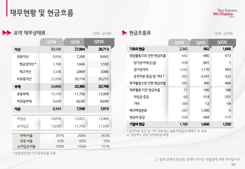 • 3분기는 OLED 중심의 사업 구조 고도화 전략과 강도 높은 원가 혁신 활동의 성과가 본격적으로 가시화된 시기