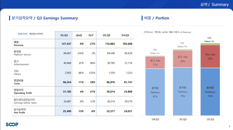 • 플랫폼 광고 매출: QoQ +20%, YoY -1%