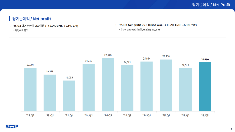 • 당기순이익: 255억 원 (QoQ +13.2%, YoY +6.1%)