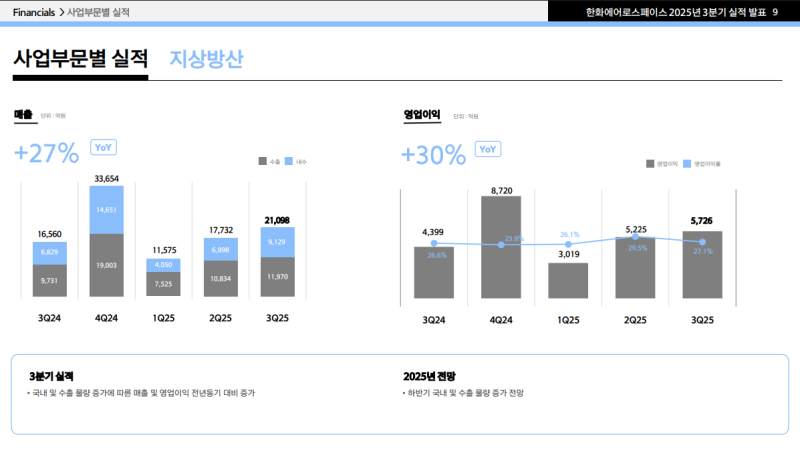 • 지상방산 및 항공우주 부문 매출 증가에 따라 매출과 영업이익 모두 확대