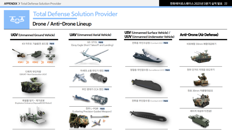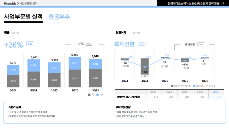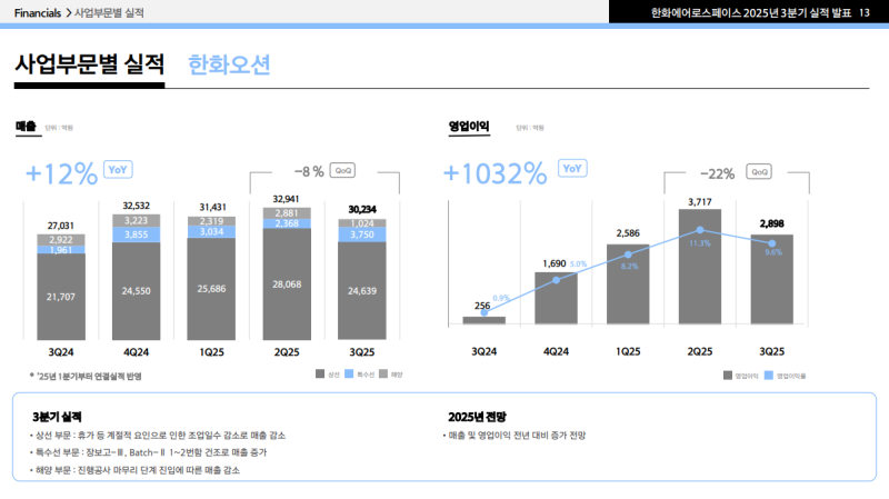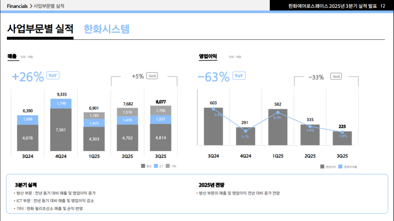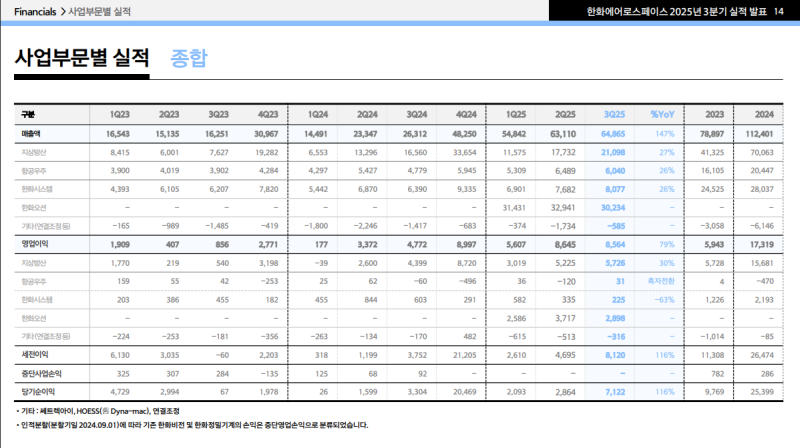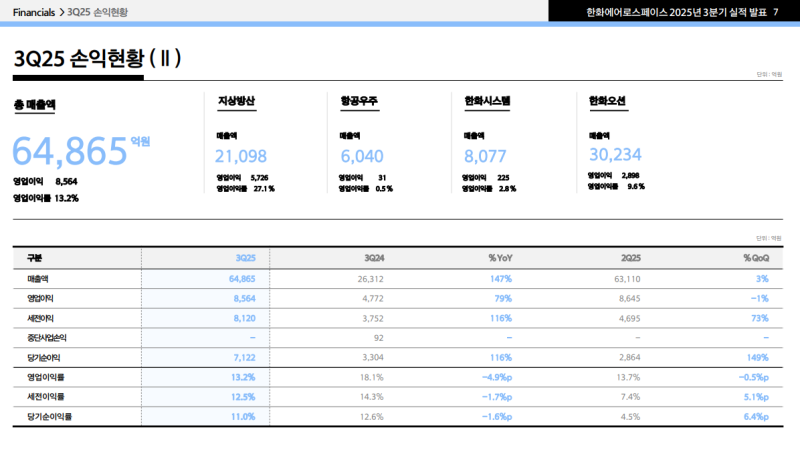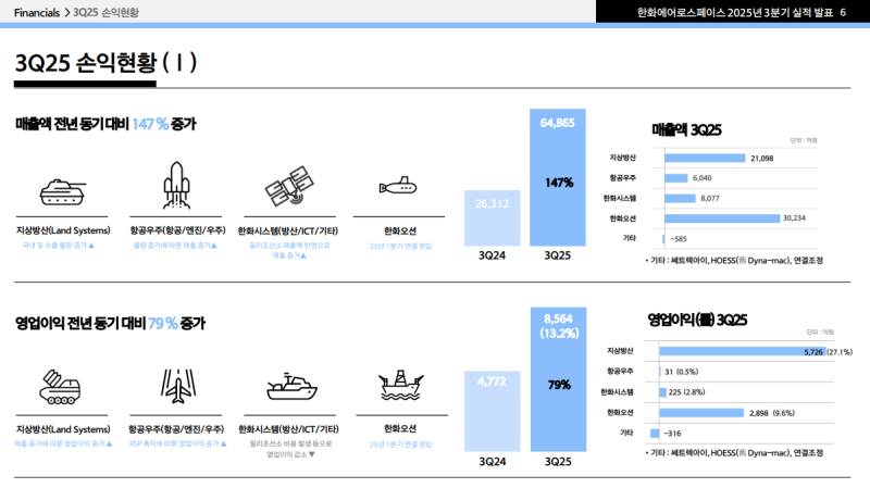 • 부문별 실적은 지상방산, 항공우주, 한화시스템, 한화오션 순으로 별도 설명 예정