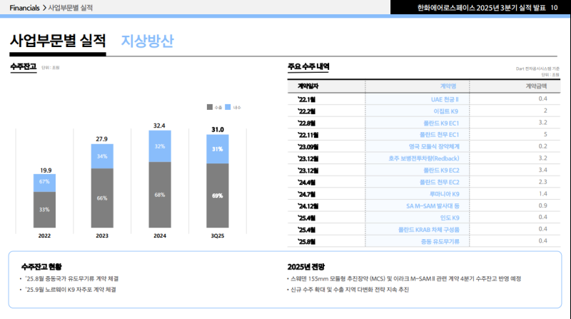 • 8월 중동향 유도무기 계약, 9월 노르웨이 K9 자주포 추가 계약, 10월 스웨덴 방위사업청과의 약 1,500억 원 규모 MCS 모듈형 추진장약 계약, 이라크 M-SAM 사업 계약 등이 이미 반영
