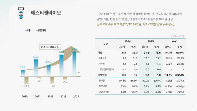 • 에스티젠바이오 매출 315억 원 (YoY +87.7%), 스텔라라BS 이뮬도사 상업화 물량 반영