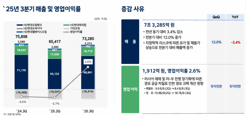 • 영업이익 1.7조 원(+294.5% YoY, +49.5% QoQ)을 기록. 정유 부문 흑자 전환 및 조선·전력기기 수익성 개선이 실적 개선 견인
