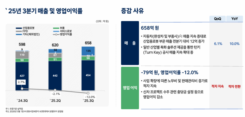 • 매출 658억 원(+6% QoQ, +10% YoY), 영업이익 -79억 원(적자 지속)