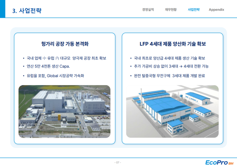 • 셋째, LFP 소재는 국내 최초로 양산급 4세대 제품 생산 기술 확보