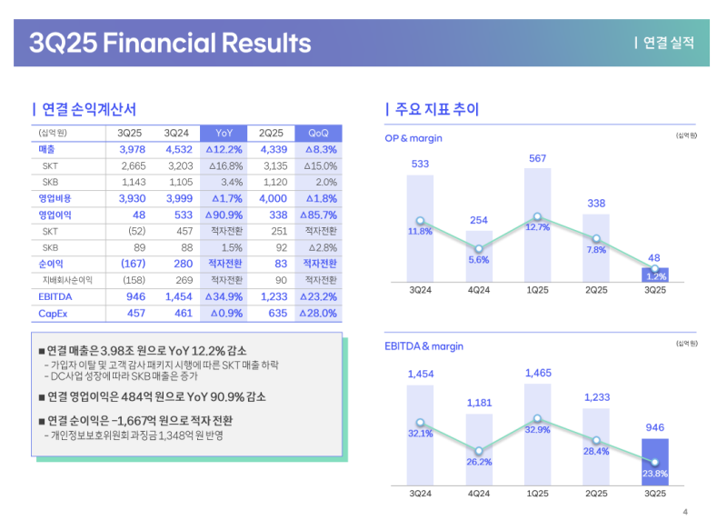 • 사이버 침해 사고 여파로 매출 3조 9,781억 원(-12.2% YoY), 영업이익 484억 원(-90.9% YoY) 기록