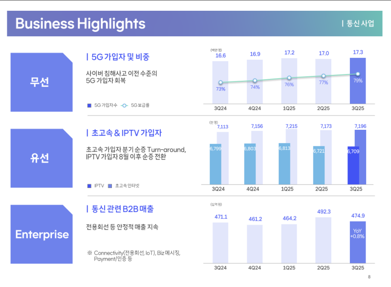 • 유무선 통신사업은 사이버 침해사고의 여파를 점차 회복 중