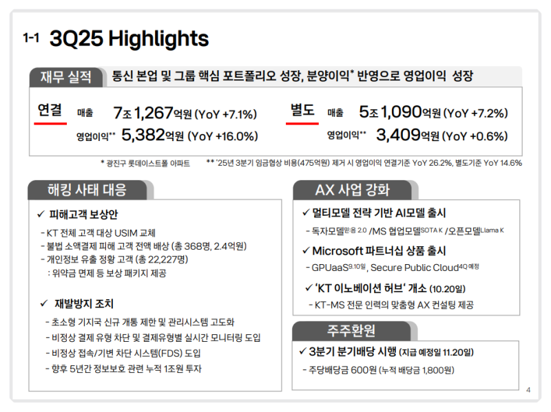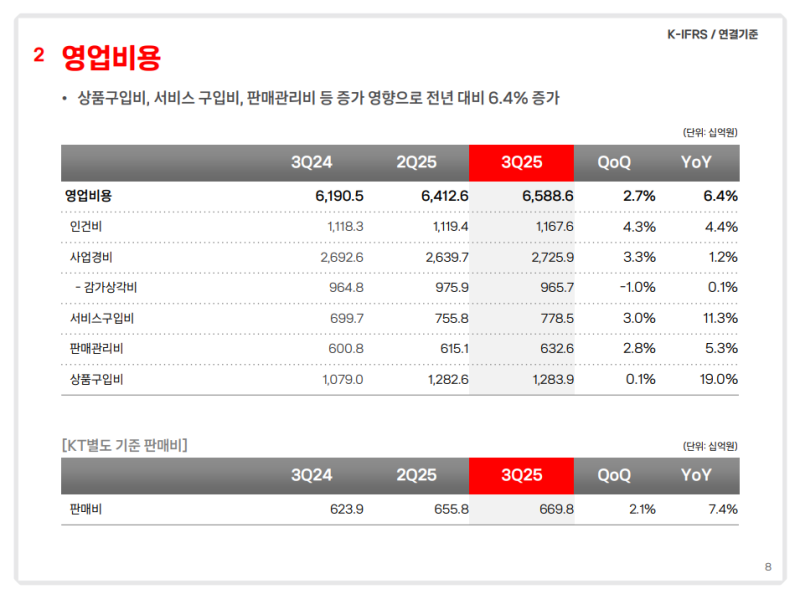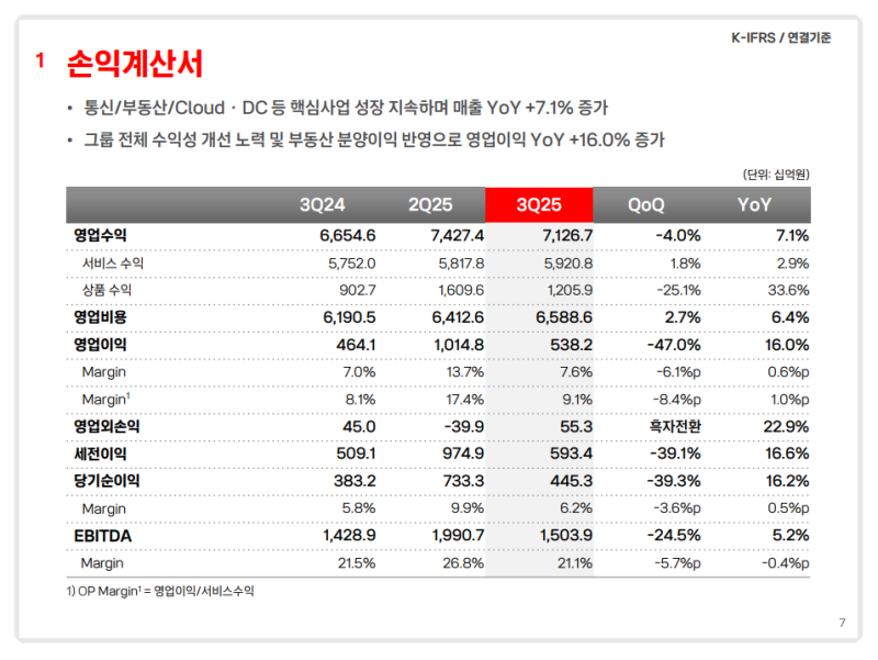• 3분기 영업수익 : 7조 1,267억 원 (YoY +7.1%)