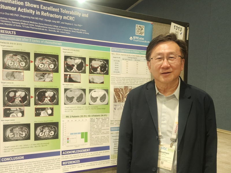 에스티큐브는 10일 난치성 전이성 대장암 치료제 개발을 위한 2건의 임상 결과를 미국 면역항암학회(SITC 2025)에서 발표했다고 밝혔다.