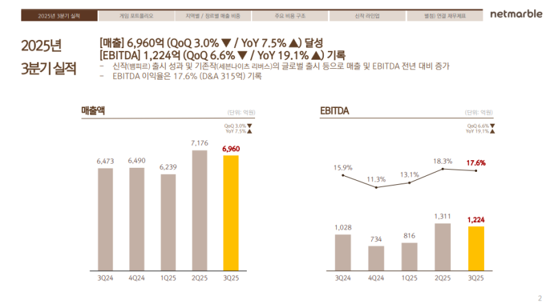 • 3분기 매출 6,960억 원 (QoQ -3%, YoY +7.5%), EBITDA 1,224억 원 (QoQ -6.6%, YoY +19.1%) 기록