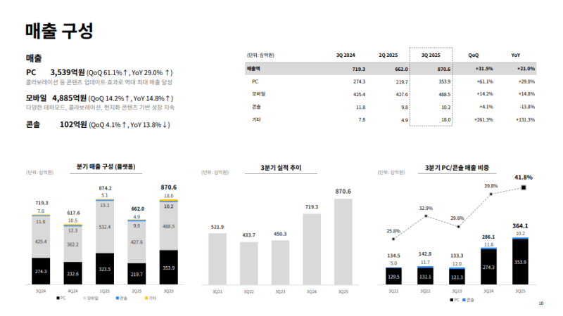 • 3분기 매출: 8,706억 원, 영업이익: 3,486억 원