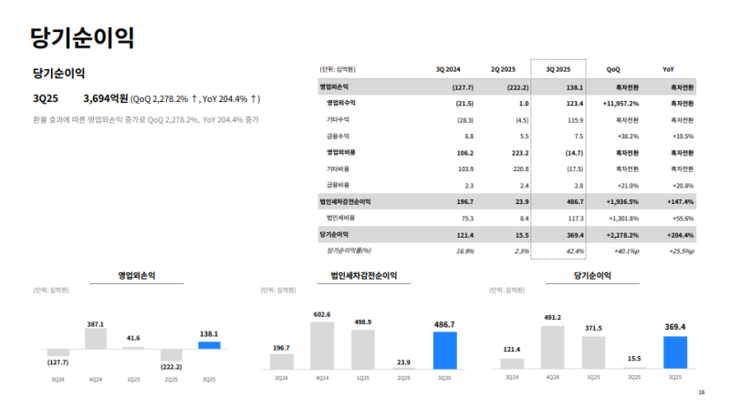 • 순이익 3,694억 원 (QoQ +2,278%, YoY +204%)