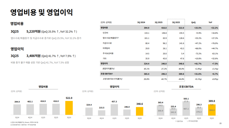 • 지급 수수료는 PUBG 2.0 외주 개발비, 언어 월즈 소송 비용, PNC 개최 영향으로 전년 동기 및 전분기 대비 증가한 1,416억 원 기록